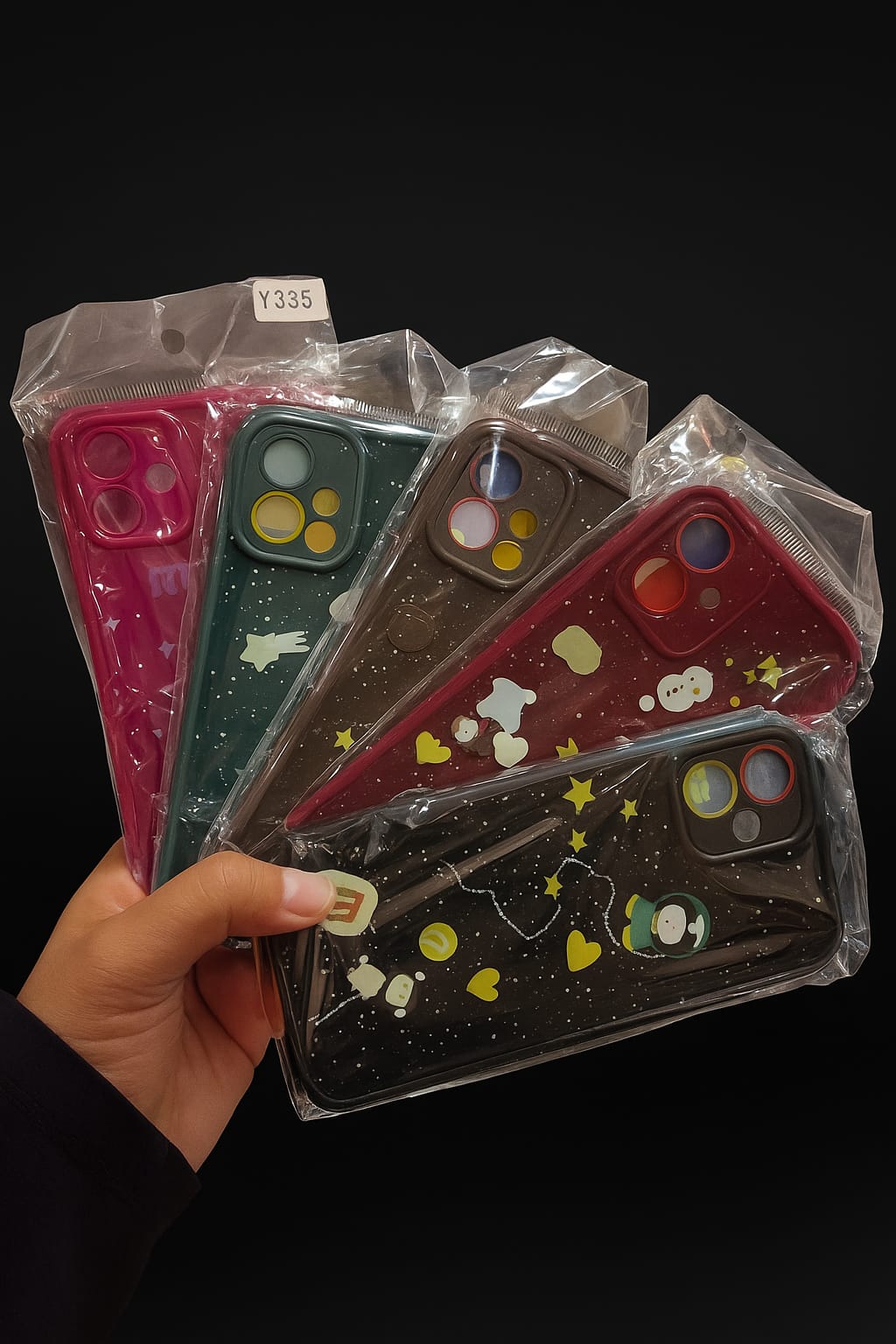 These cases are designed for style and protection. They are made from a soft, flexible material like silicone or TPU, which provides good shock absorption and a comfortable, anti-slip grip. Each case features a unique, colorful, and playful design with a dark base and a pattern of stars, planets, and cartoon characters. The camera cutout is prominent, with a large, glossy, and raised border to protect the camera lenses from scratches. The cases come in a variety of base colors, including a transparent starry pattern, pink, green, and burgundy.